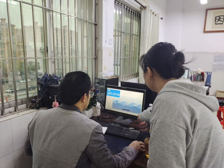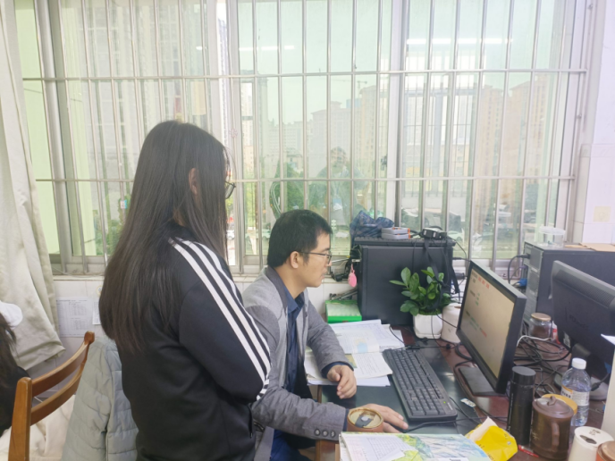 (指导教师张波与实习教师韦冰讨论、修改课件)