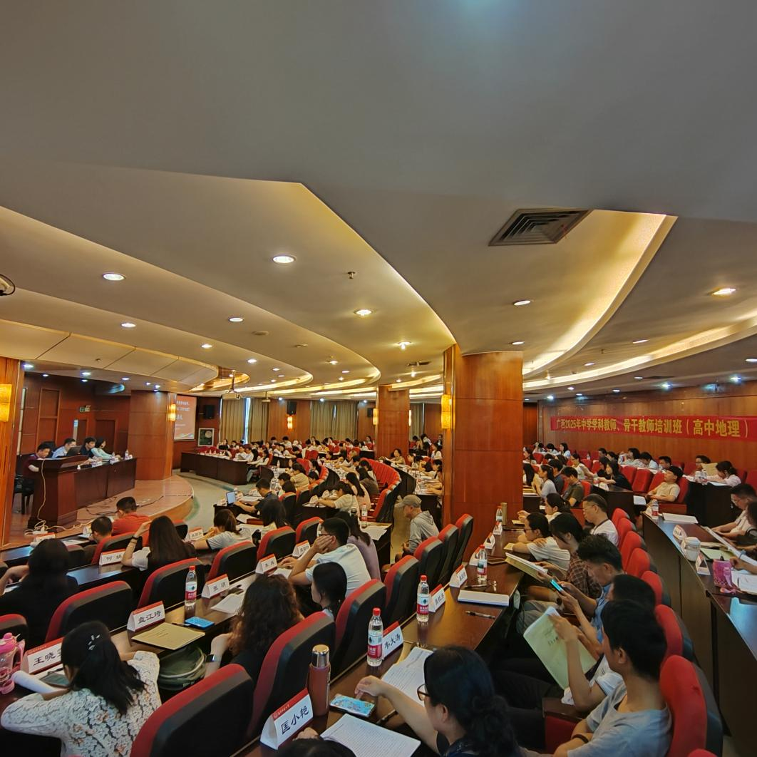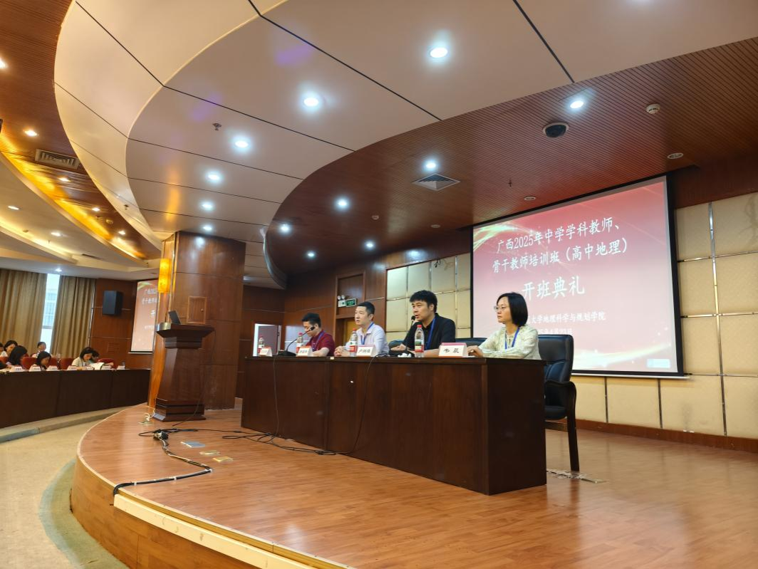 4月23日,由 成人影视片 协办的广西2025年中学学科教师、骨干教师培训班(高中地理)在明秀校区图书馆三楼报告厅顺利开班, 成人影视片 副院长罗国玮、院长助理卢炳雄、地理科学系副主任韦晨、刘立昌副教授以及来自广西全区各市的146名高中地理学科教师、骨干教师出席开班仪式。