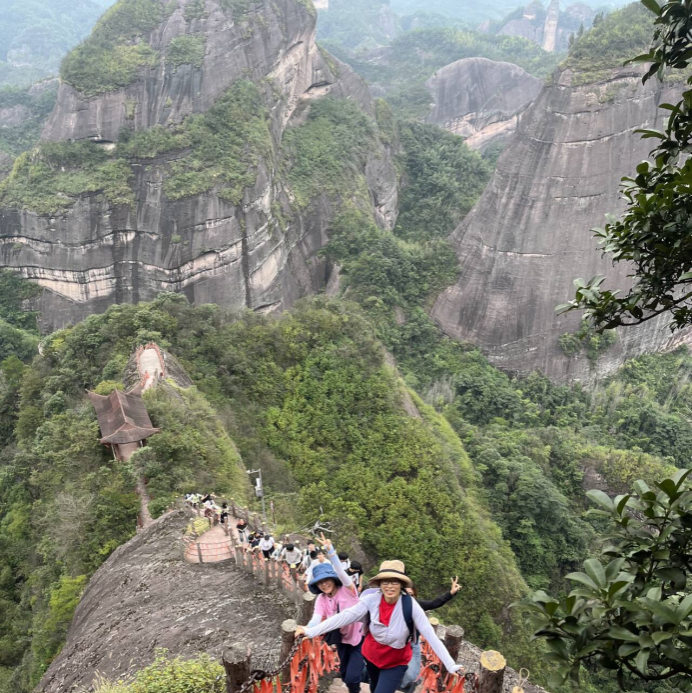 9月27日上午,师生们来到了中国最美七大丹霞之一的八角寨。沿山脊徒步向上,白琨琳老师以红色砂砾岩为例,开启了现场教学,通过岩层中清晰可见的砂砾颗粒与层理构造,带领同学深入了解陆相积的典型特征。同学们分组记录不同地段的地貌形态、识别白垩纪砂砾岩的岩性特征、沉测量岩石产状。当师生们登上八角寨顶,丹霞地貌的雄奇险峻令人震撼,红色岩层历经风化侵蚀形成的奇特景观,让师生们深刻领略到地球演化的壮阔。