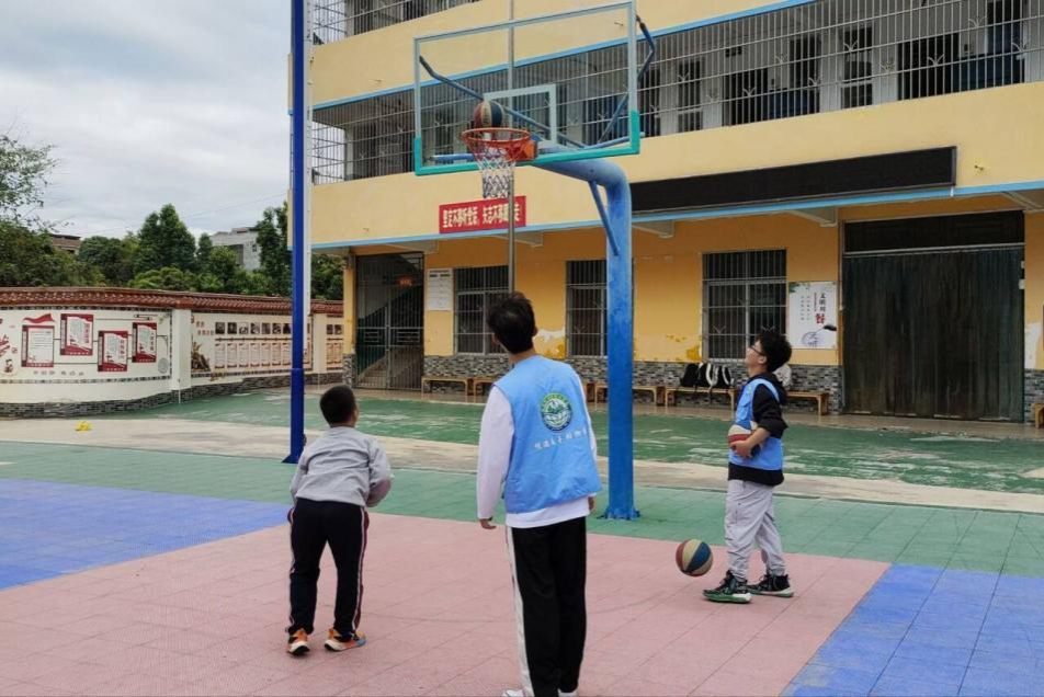 (志愿者陪同小朋友打篮球)