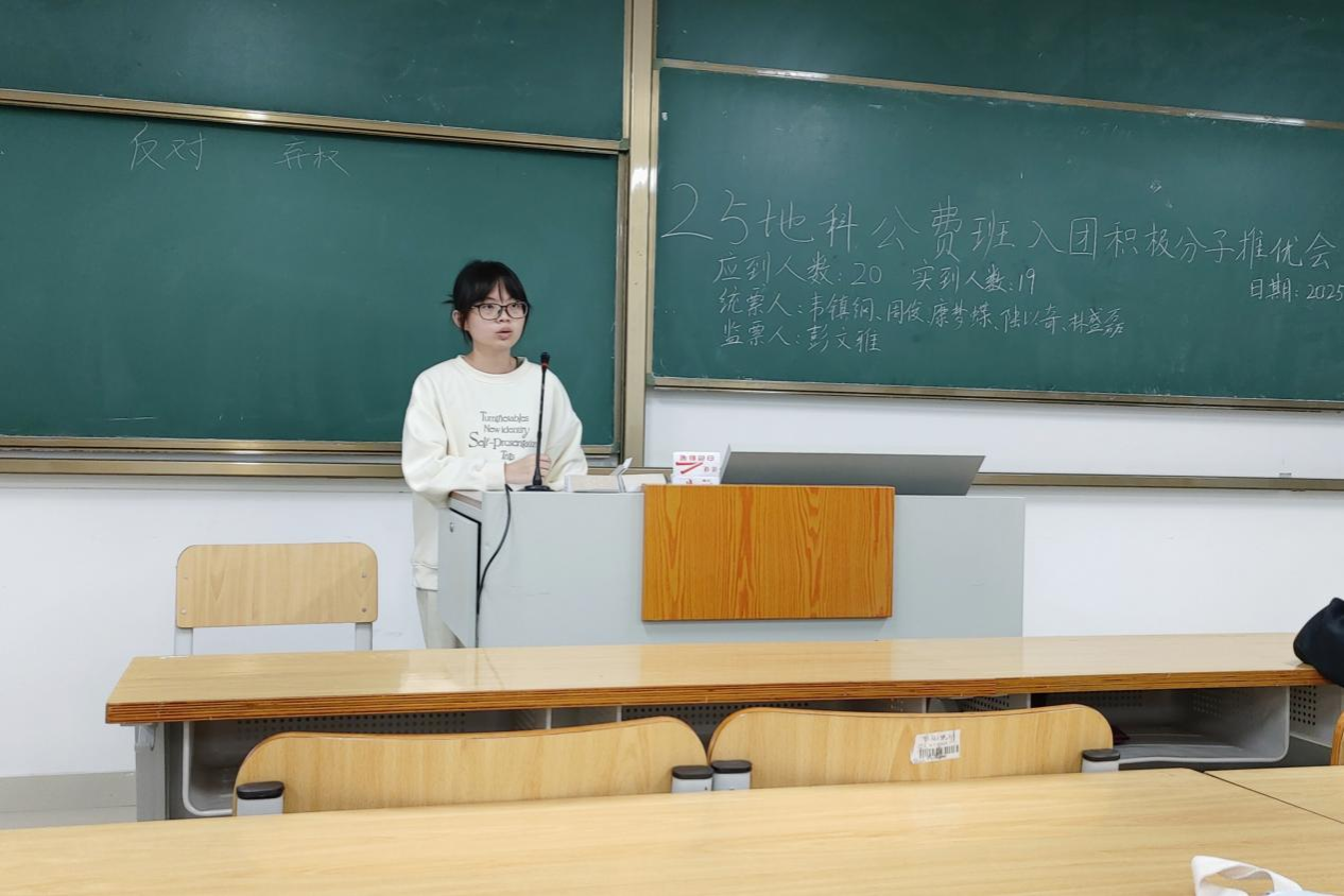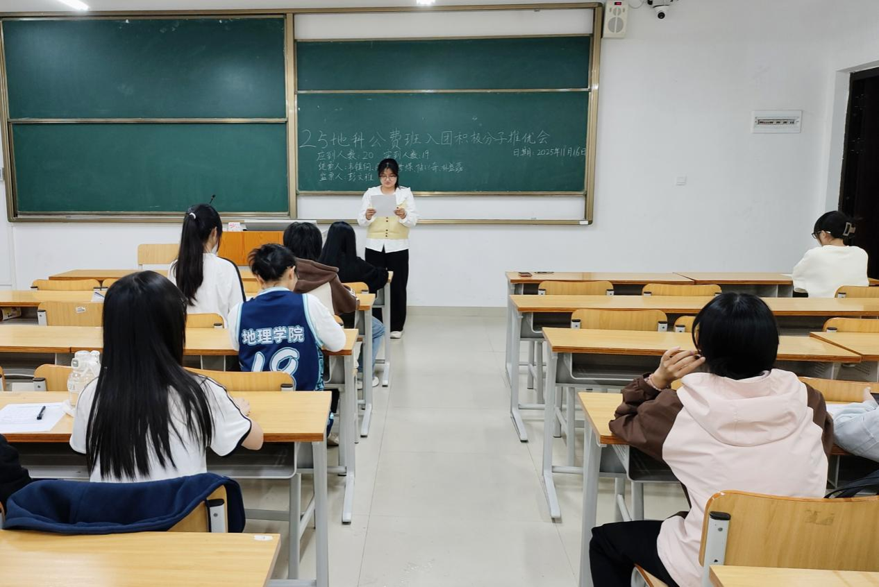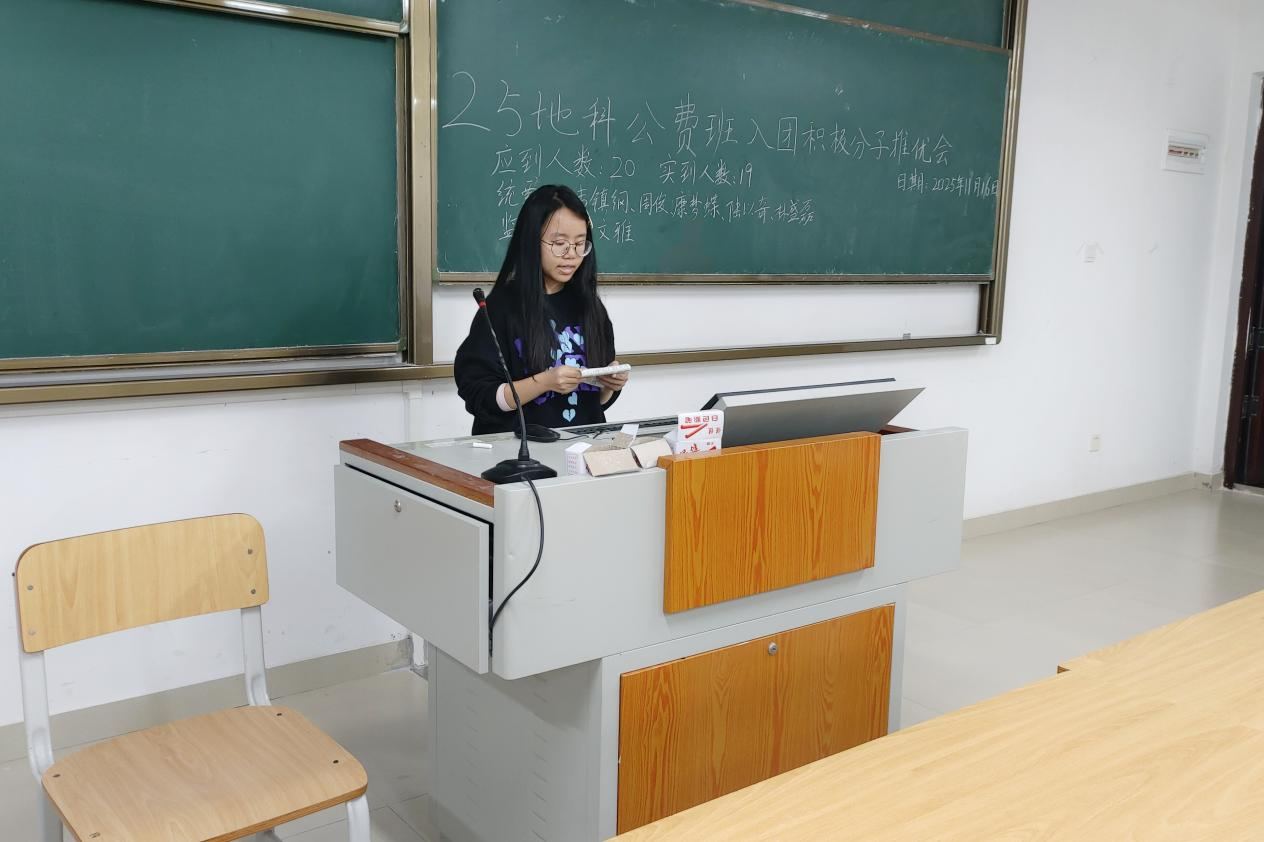 11月16日, 成人影视片 2025级地科公费班在武鸣校区实验楼2号楼C102教室顺利召开入团积极分子推优会。会议由团支书康梦蝶同志主持,助理班主任彭文雅同志出席会议,2025级地科公费班全体同学参与会议。