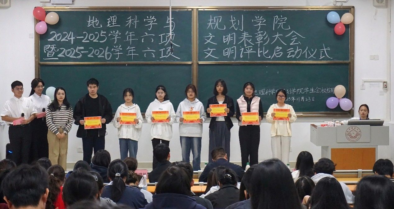 致辞结束后,大会进入表彰环节。在过去一学年里,学院涌现出一批在文明创建工作中突出的先进集体,这些集体立足自身、示范引领,充分展现了地理学院学子的良好精神风貌。学院兼职辅导员黄小为获奖代表颁发荣誉证书,并勉励大家珍惜荣誉,再接再厉,持续发挥模范带头作用。仪式最后,大会正式启动了2025-2026学年“六项文明”评比工作,激励全院师生见贤思齐,主动践行文明规范,将文明修养内化于心、外化于行。