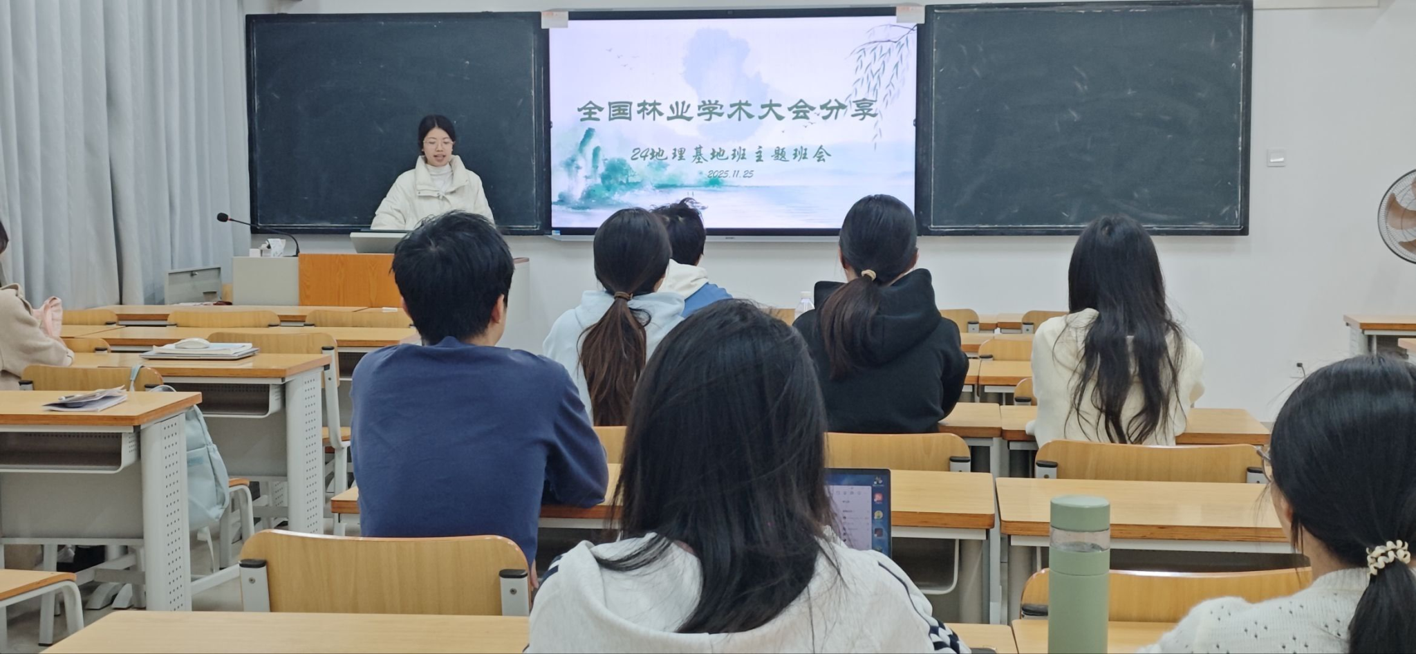 会后,两位同学在罗蜜老师主持的主题班会上,分享了参会收获与思考。她们结合朱有勇院士“把论文写在大地上”的典型案例,生动讲述了科技服务脱贫攻坚的实践路径,并交流了多位院士报告中的创新思维与方法,有效激发了全班同学投身地理科学研究的兴趣与热情。