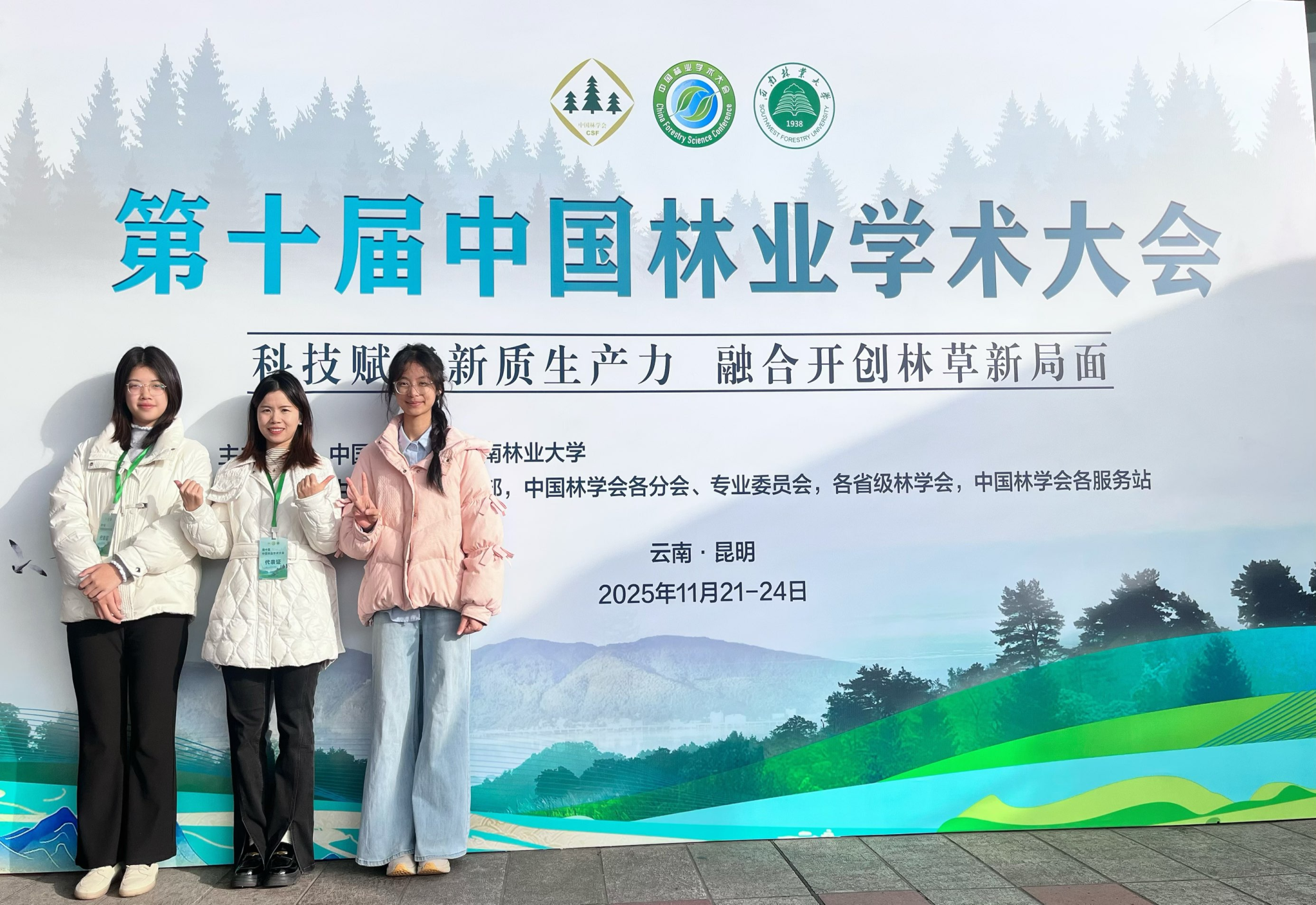 2025年11月21日至24日,第十届中国林业学术大会在昆明举行。学院24级地理科学拔尖人才培养基地班张钰桐、檀佳杏两位同学,在罗蜜老师的带领下参加了此次学术盛会。会议期间,同学们聆听了多位院士和知名专家的主旨报告,重点围绕“林草科技创新”、“森林碳汇监测的遥感技术应用”等前沿议题进行了深入学习,切身感受到地理信息技术在林业资源管理与可持续发展中的关键作用,深化了对学科交叉融合价值的认识。