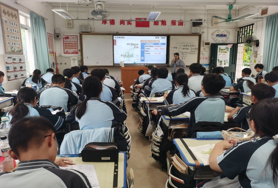 实习教师陈海冰作为初一年级地理实习老师代表,在初一十一班教室进行汇报课《海陆变迁》展示。课堂教学展示时,实习教师陈海冰以“鸮头贝为海底生物,为何出现在广西陆地上?”作为导入,结合地图、材料积极引导学生思考,密切关注学生的反应,灵活调整上课节奏。