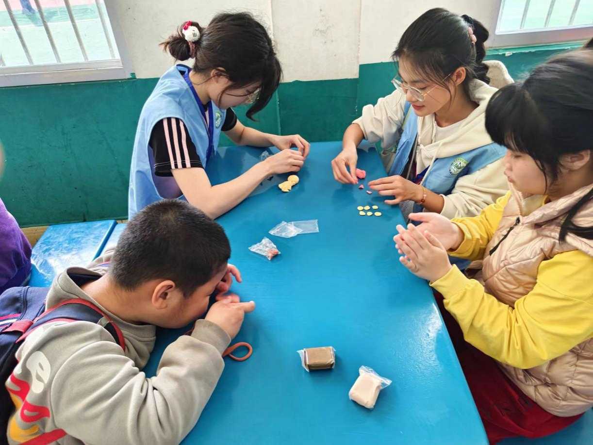 (志愿者与小朋友们玩胶泥塑型)