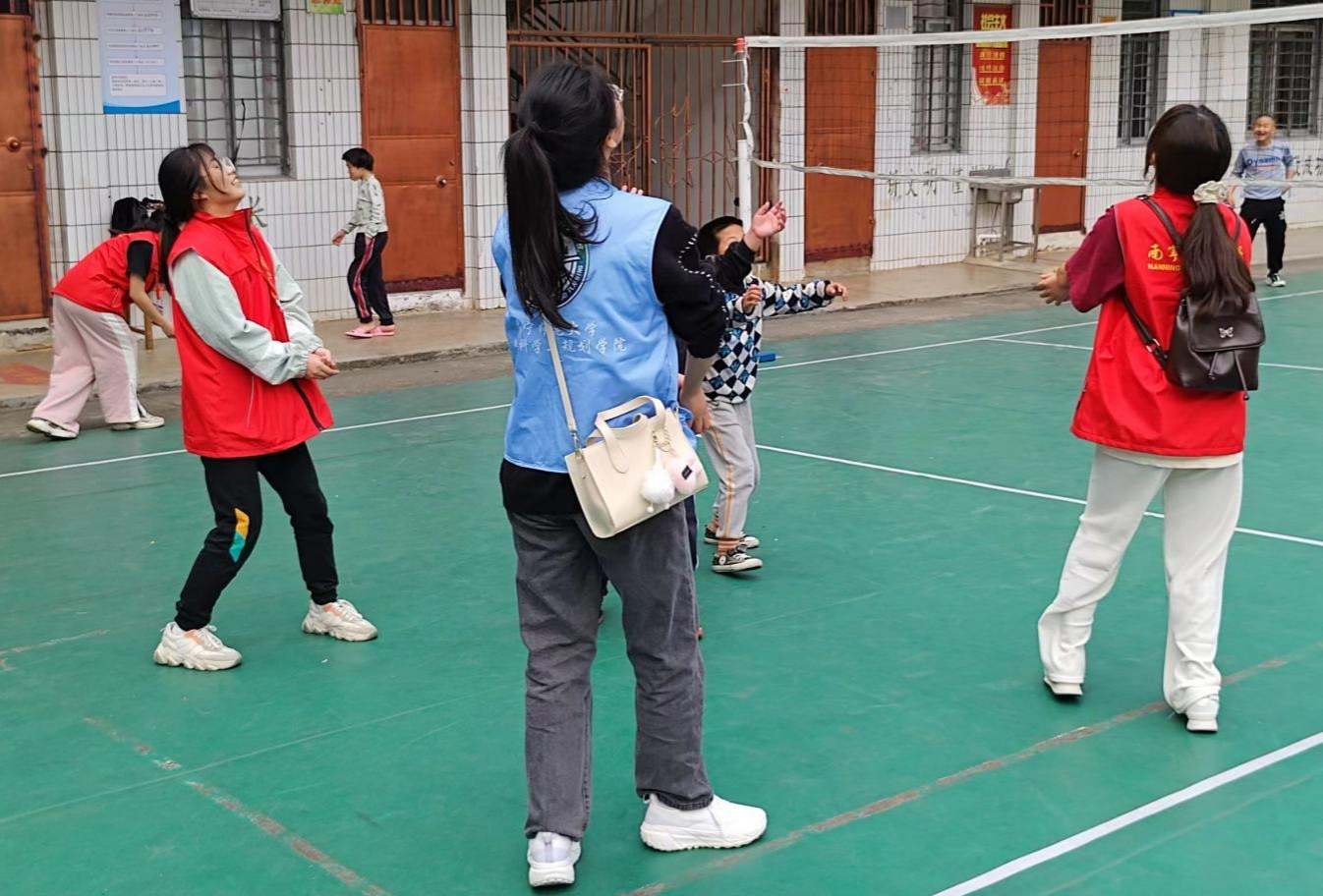 活动伊始,小朋友们在志愿者的引导下,进行名为“胶泥塑型”的游戏,每个志愿者与两位小朋友一起用胶泥创造出各种奇妙的事物。紧接着,志愿者与小朋友们一起进行了“飞扬沙包”和“老鹰捉小鸡”的游戏。每一位小朋友都玩得很开心,所有人的脸上都洋溢着快乐的笑容。不仅如此,志愿者们还和他们一起进行篮球、排球等球类友谊赛。简单而充满趣味的游戏和友谊赛,让校园内洋溢着轻松愉悦的氛围,欢乐与祝福交融,成长与祝愿交织,小朋友们用欢乐释放爱意,尽情享受着快乐时光。
