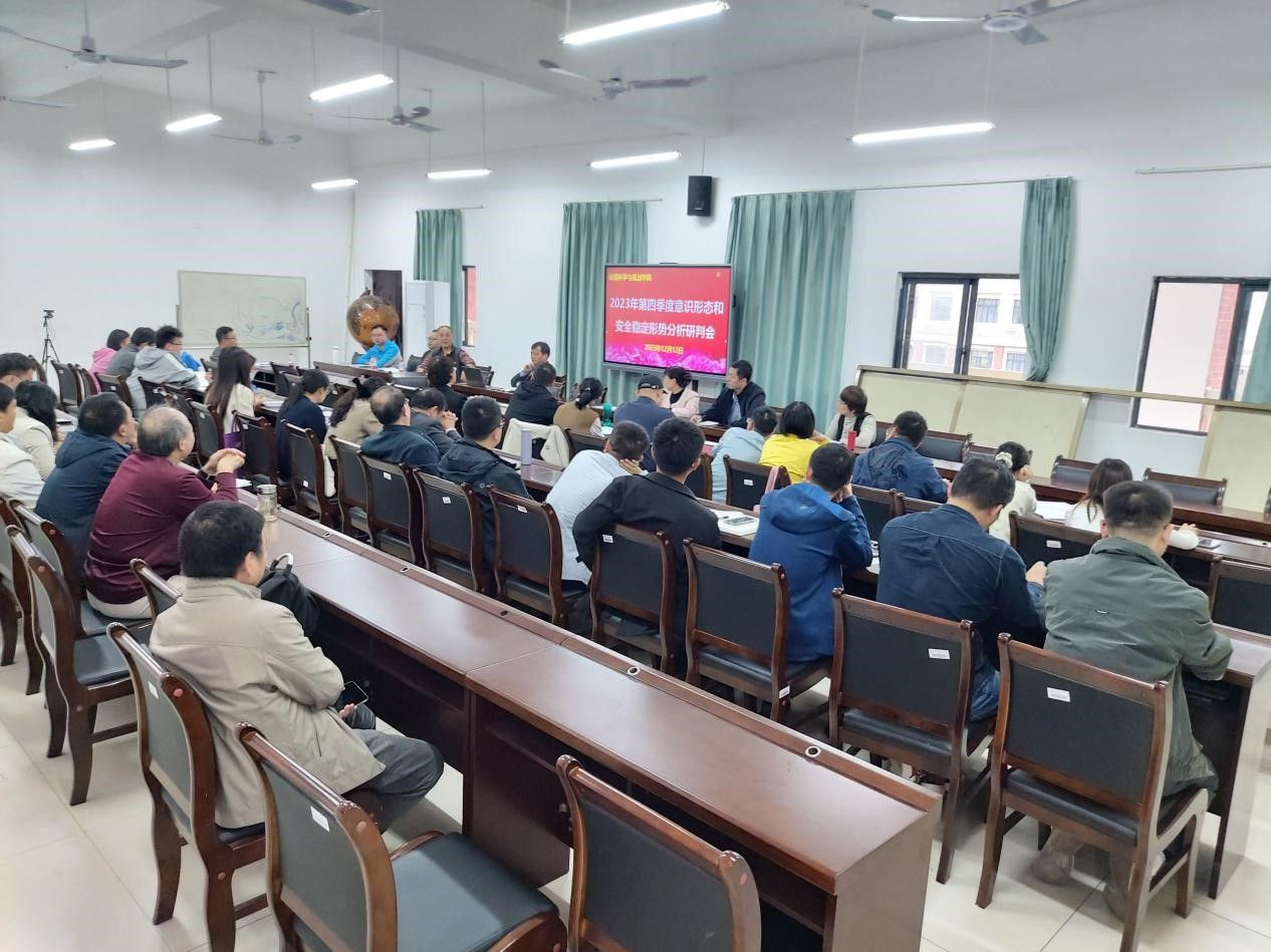 12月12日下午, 成人影视片 在武鸣校区地源楼C401召开2023年第四季度意识形态和安全稳定形势分析研判会。本次会议由学院党委书记严志强主持,全体教职工参加会议。