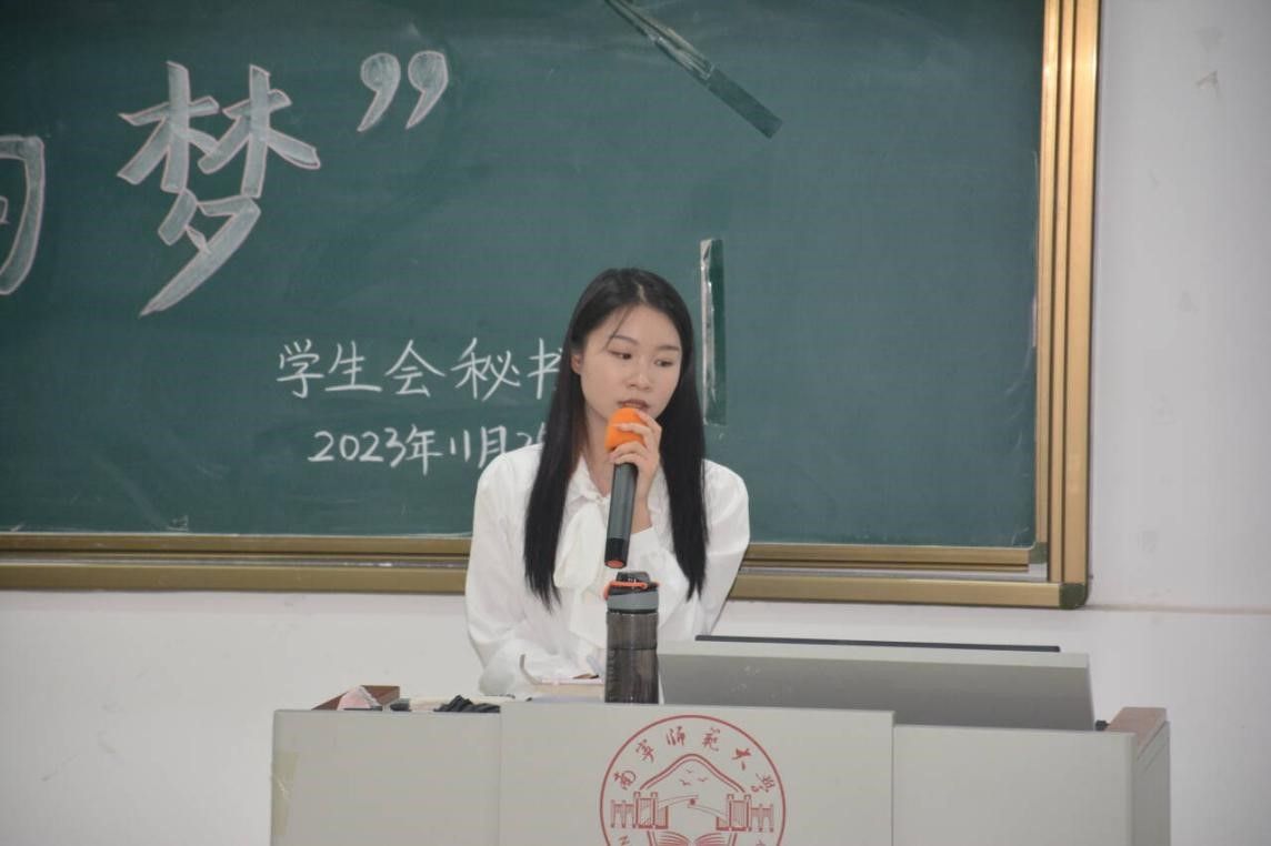 会议开始,四位学生代表先后上台发言。优秀学生代表黄妍瑛和梁玲倩分别分享了她们的学习方法与生活经验,讲述了她们的学习生活。她们还为同学们解答了如何在当今“内卷”的环境学会休息和享受生活的问题,提出了许多实质性的建议。梁玲倩强调“要学会热爱,热爱生活,热爱自己的专业”,她以自身专业的学习经历为例来教会同学们如何热爱并学好自己的专业。第三和第四位优秀学生代表陈敏茹和罗芯曼都与同学们谈论自身的努力及发展方向,使同学们重视对大学四年规划的思考。她们希望同学们在处理各种事务上都能学会复盘和反思,建议同学们以学习为重心,养成课前预习课后复习的习惯,多向优秀的人请教,多实践、多试错。