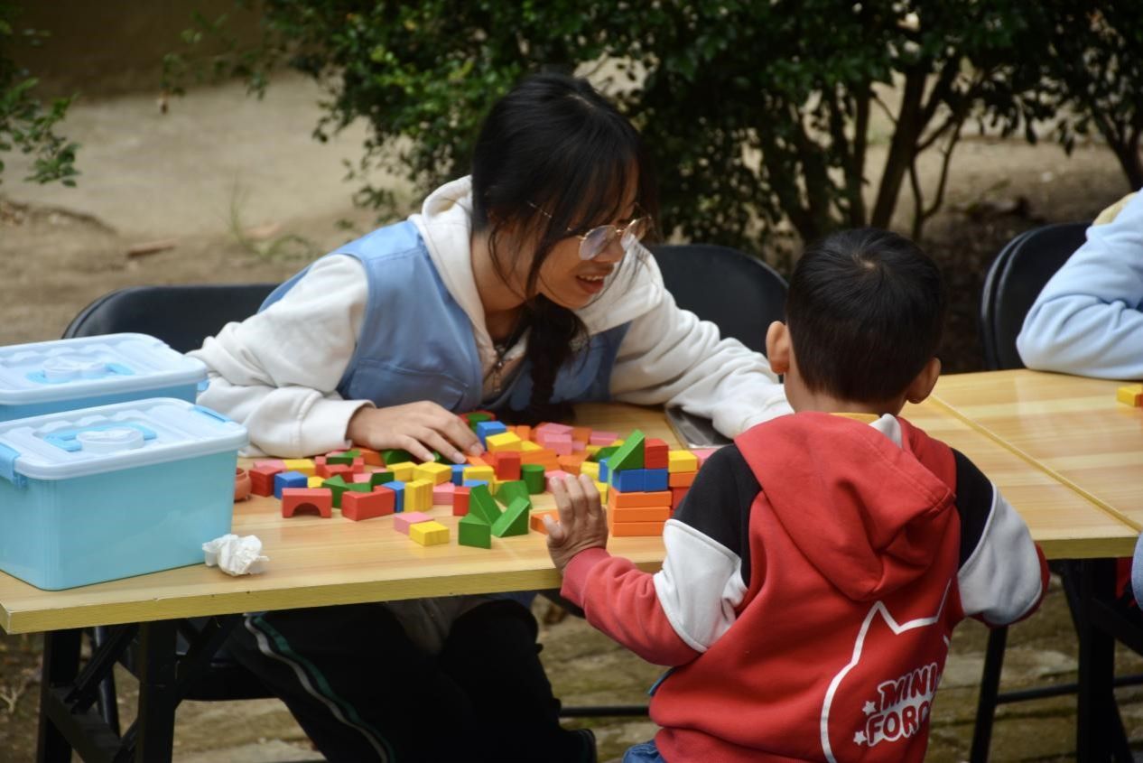 (志愿者引导小朋友搭建积木)