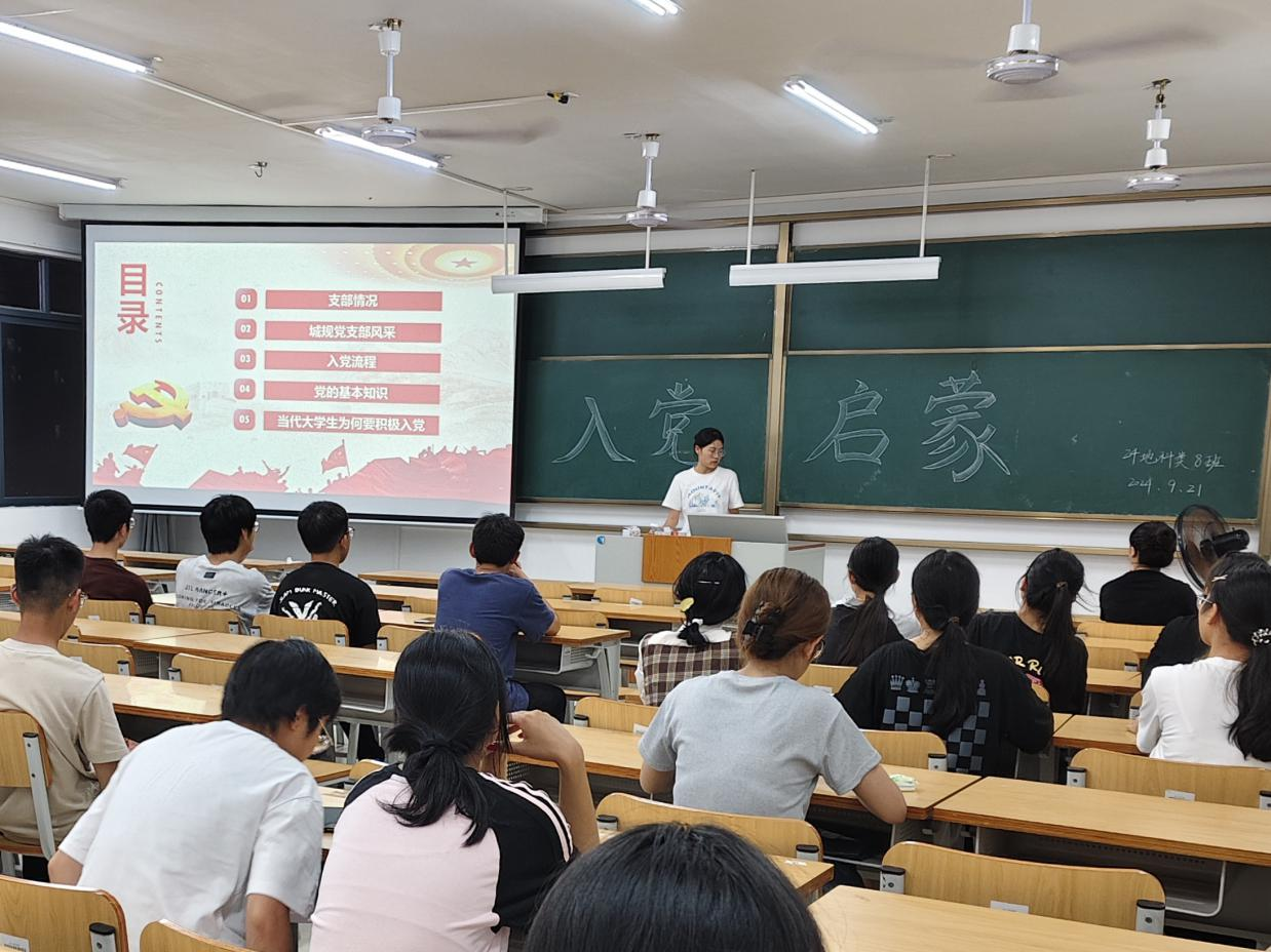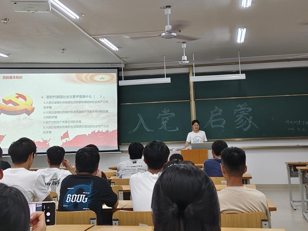 为加强同学们的入党启蒙教育,2024年9月21日,2024级地科类八班在武鸣校区实验楼2-C204教室成功开展入党启蒙活动。本次活动由班级驻党覃韦梅、韦靖两位同志共同组织,24级地科类八班全体同学共同参与。