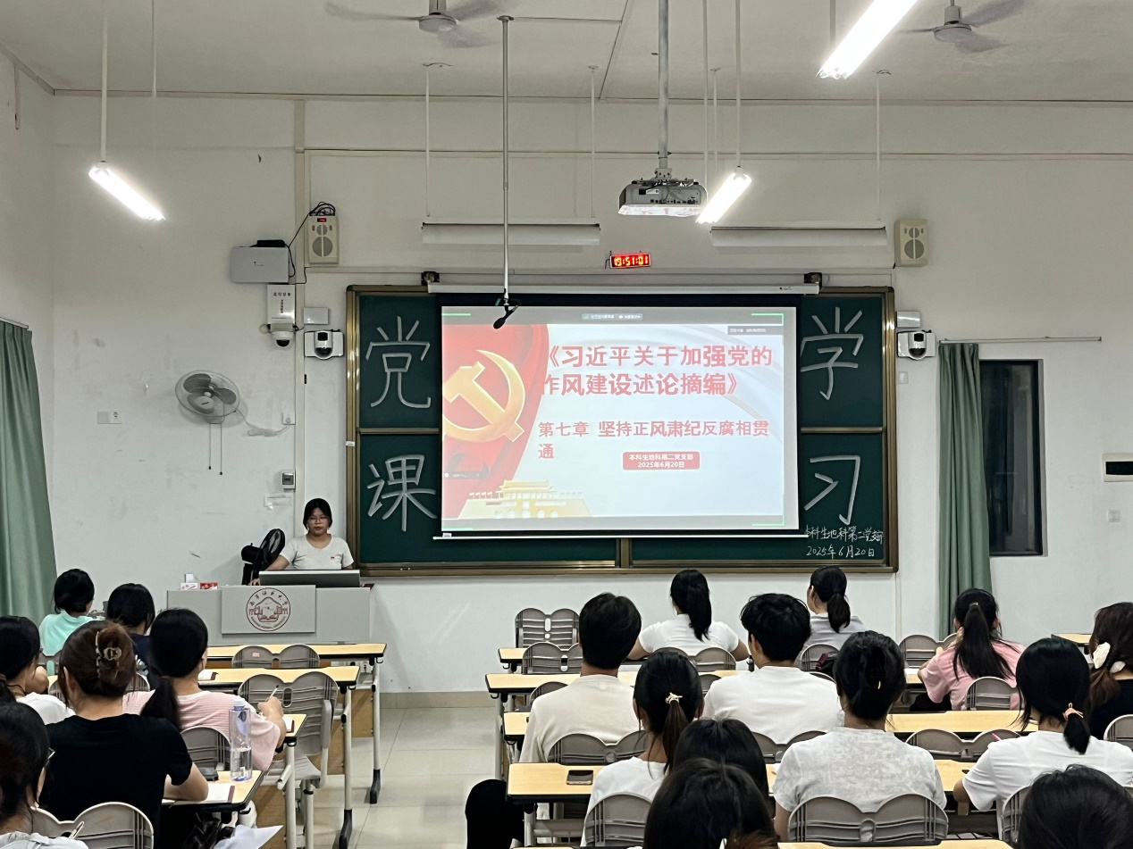 6月20日, 成人影视片 本科生地科第二党支部在武鸣校区1号教学楼116教室组织开展“坚持正风肃纪反腐相贯通”专题党课学习。本次党课由党支部书记冼晶晶同志主持,党支部全体党员共同参与。
