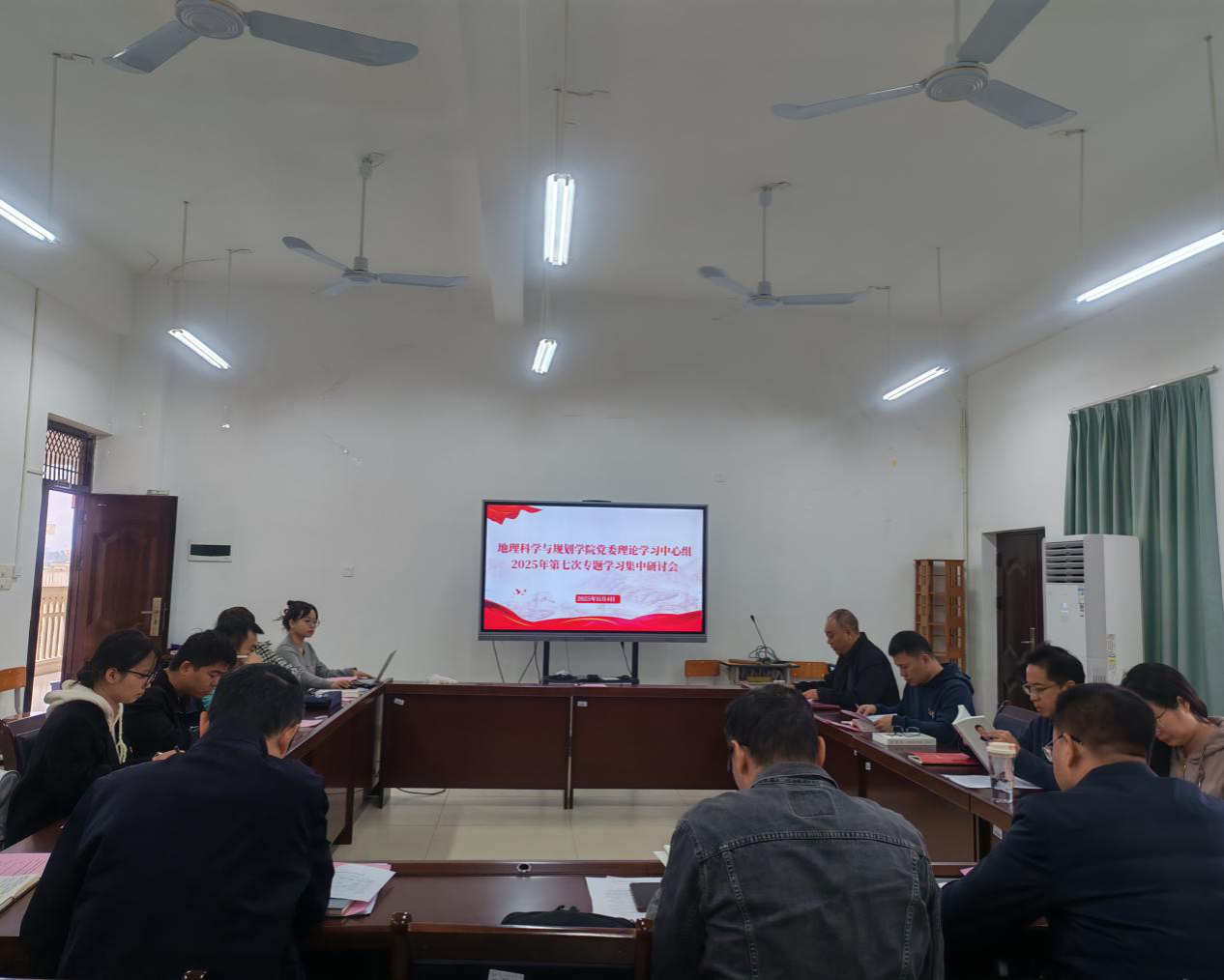 2025年11月4日下午, 成人影视片 党委理论学习中心组在武鸣校区地源楼C401会议室,组织召开2025年第七次专题学习集中研讨会。会议由学院党委书记严志强主持,学院党委理论学习中心组成员及各党支部书记参加会议。会前,中心组成员围绕学习材料开展了为期一周的个人自学。