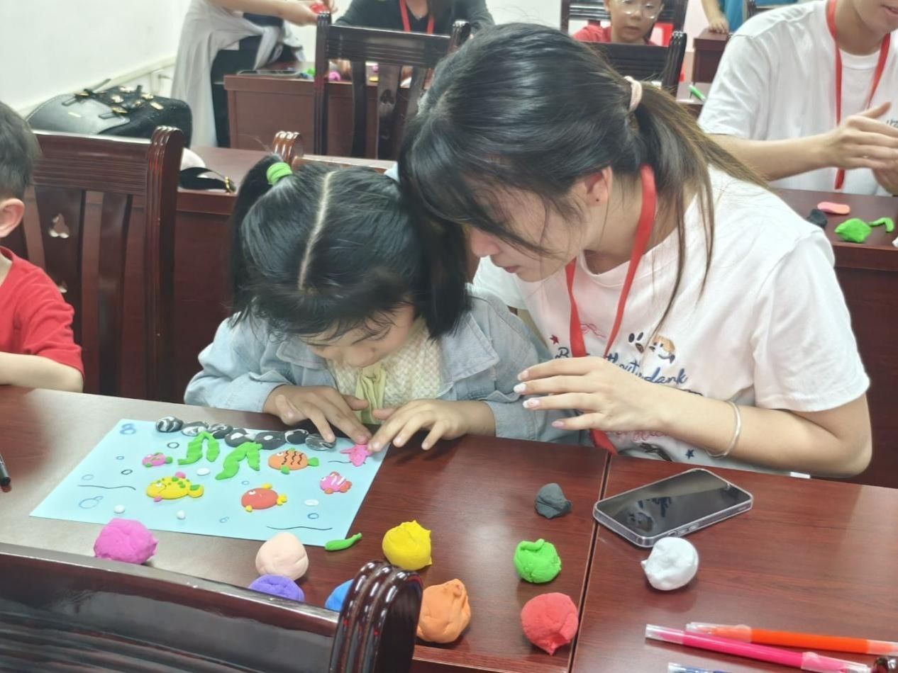 活动伊始,志愿者结合PPT,向社区儿童介绍了水资源的分类、现状,志愿者简要介绍了人类生活依赖的水源为淡水资源,并说明了我国目前淡水资源匮乏的现状,引导树立节约用水的意识。在志愿者的指导下,社区儿童用卡纸制作节约用水的图画,用粘土捏造出水里的小动物,这不仅促进他们形成保护水资源的意识,而且提升了小朋友的动手创作能力。