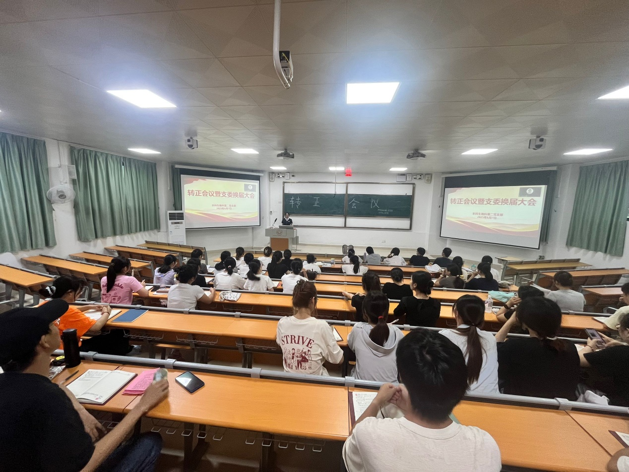 6月7日, 成人影视片 本科生地科第二党支部在武鸣校区2号教学楼121教室召开中共预备党员转正会议暨支委换届大会。本次会议由黄小同志主持,支部全体党员参会。
