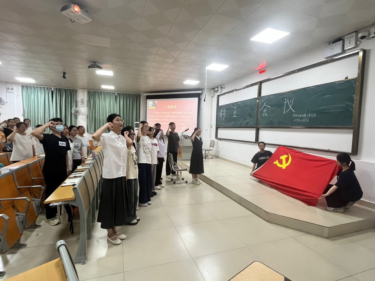 会上,黄渝铃等11位中共预备党员依次宣读转正申请书,向党组织汇报个人在预备期期间的思想、学习和生活等方面的情况,正式党员就其是否转正问题进行了充分讨论。随后,与会正式党员进行无记名投票,大会一致同意接收黄渝铃等11名中共预备党员转为中共党员。接着,全体与会党员在黄小同志的带领下,面向党旗进行宣誓,向党组织立下了郑重的承诺。