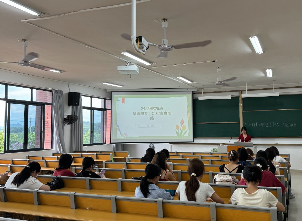 6月23日,2024级地科类五班在武鸣校区2号实验教学楼A202教室举办主题班会。此次班会以“禁毒防艾:筑牢青春防线”为主题,由班长罗子盈主持,全体同学共同参会。